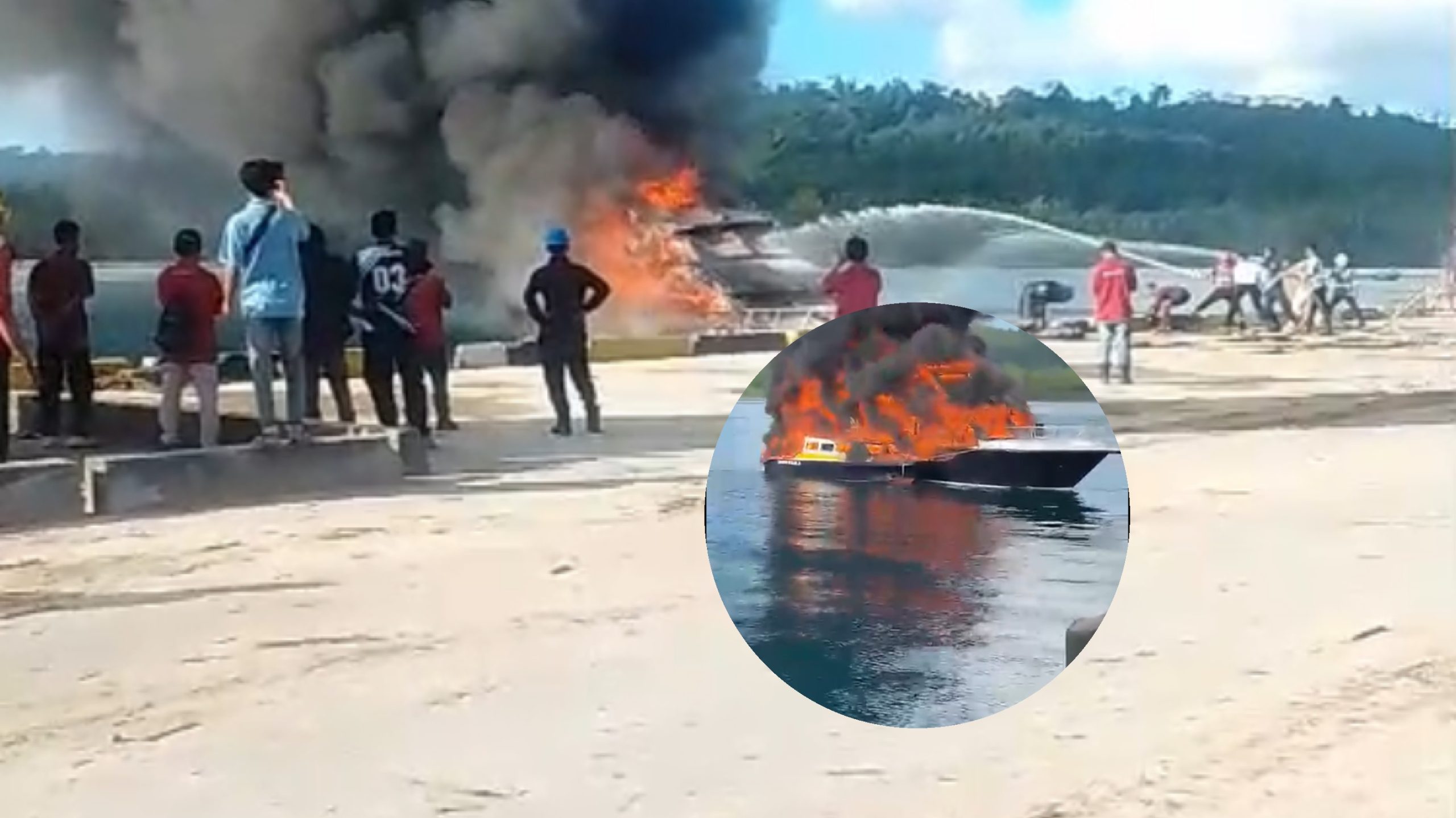 KEPULAUAN SULA-Dua unit kapal cepat milik sebuah perusahaan kayu terbakar hebat di Pelabuhan Falabisahaya, Kecamatan Mangoli Utara, Kabupaten Kepulauan Sula, Maluku Utara, Minggu (5/4).